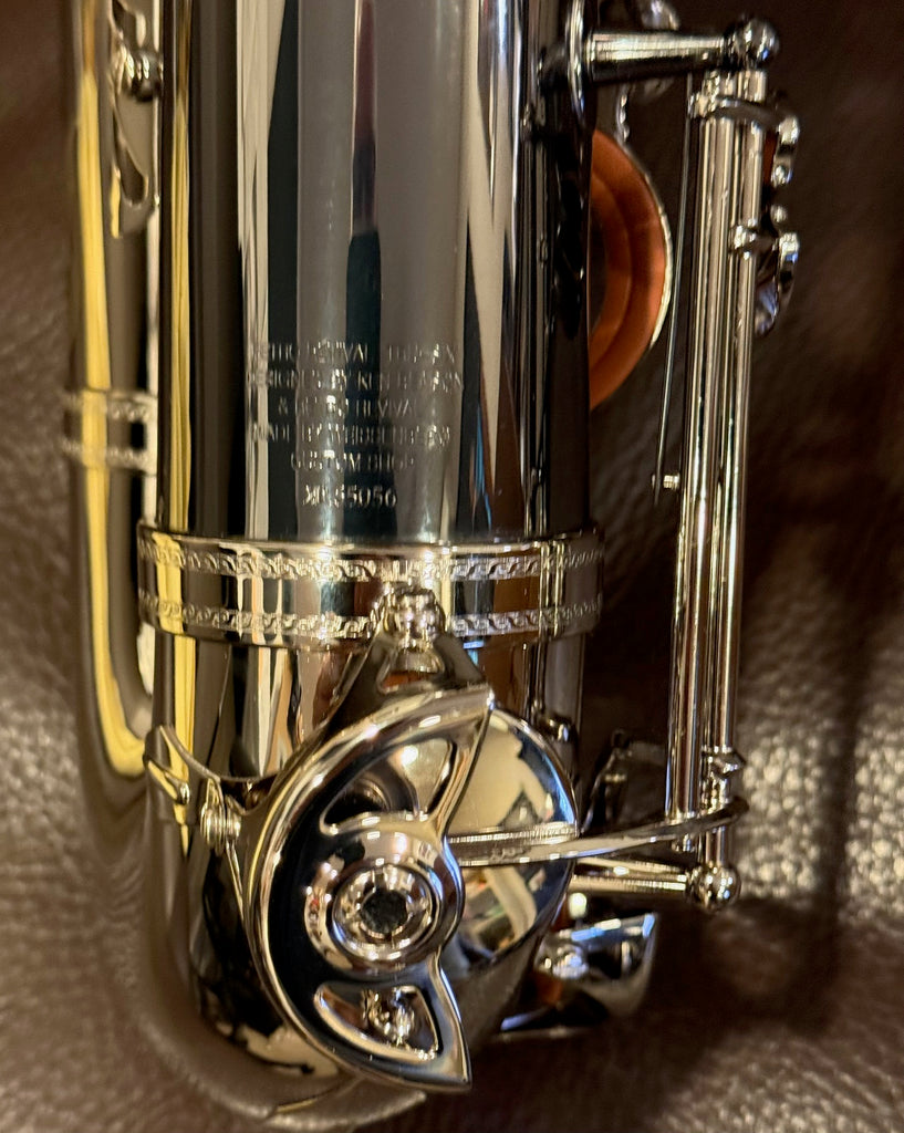 - Custom key tooling and concave mother of pearl key touches, brass swivel thumb rest, hand soldered bell